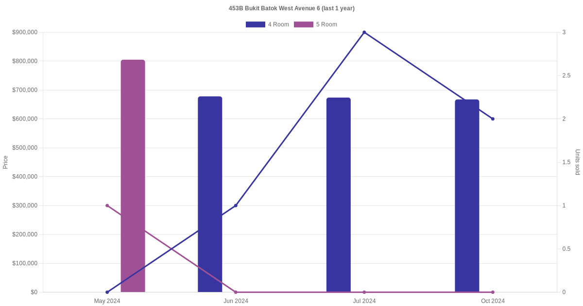 Below is a quick summary of the resale transactions volume and average price trends for the 4 room and 5 room units at 453B Bukit Batok West Avenue 6.