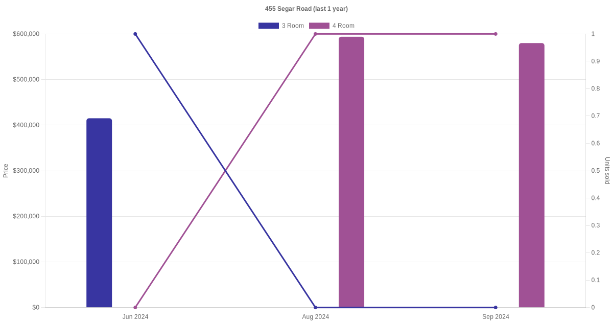 Below is a quick summary of the resale transactions volume and average price trends for the 3 room and 4 room units at 455 Segar Road.