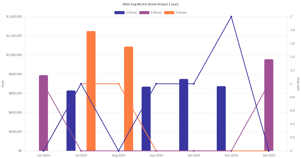 Here's a summary of the rental transactions and price trends for the 3 room, 4 room and 5 room units at 455A Ang Mo Kio Street 44.