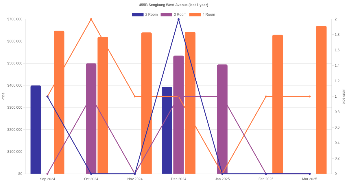Here's a summary of the rental transactions and price trends for the 2 room, 3 room and 4 room units at 455B Sengkang West Avenue.