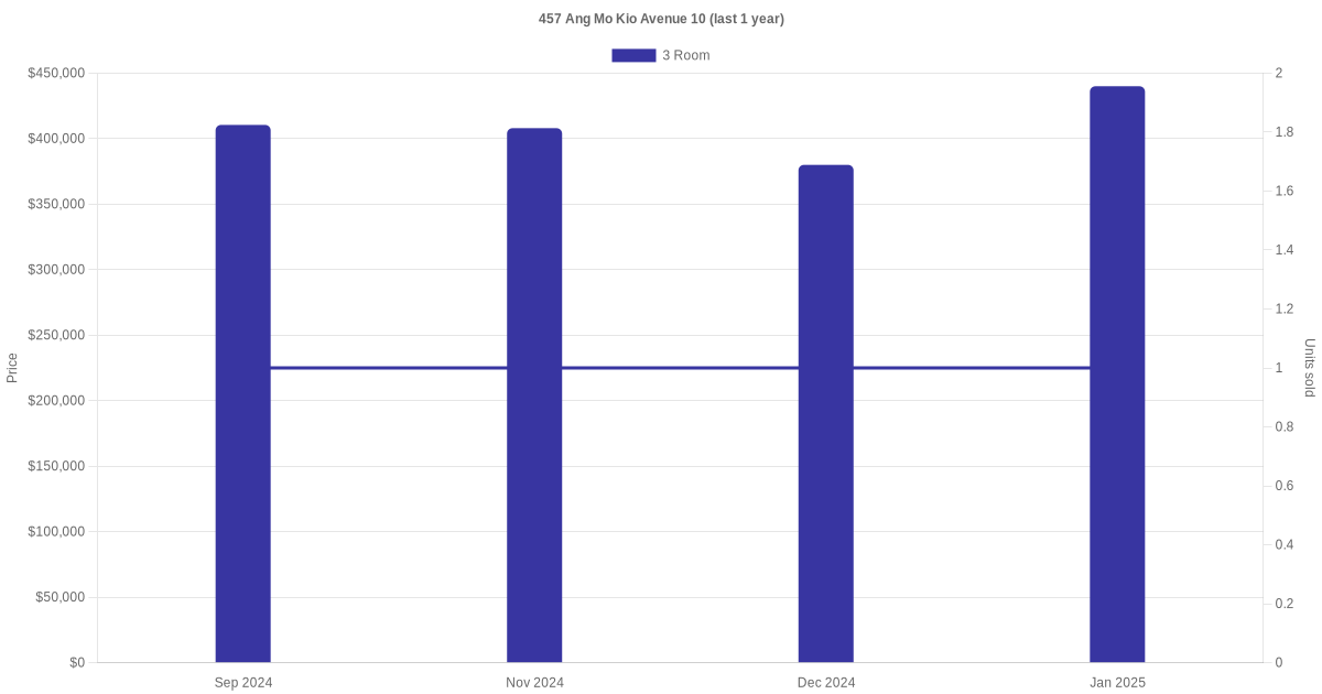 | Jan 2025 | $3,350 | 3 Room | Blk 457 Ang Mo Kio Avenue 10 3 Room | Ang Mo Kio |