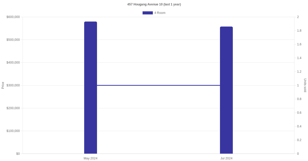 Below is a quick summary of the resale transactions volume and average price trends for the 4 room units at 457 Hougang Avenue 10.