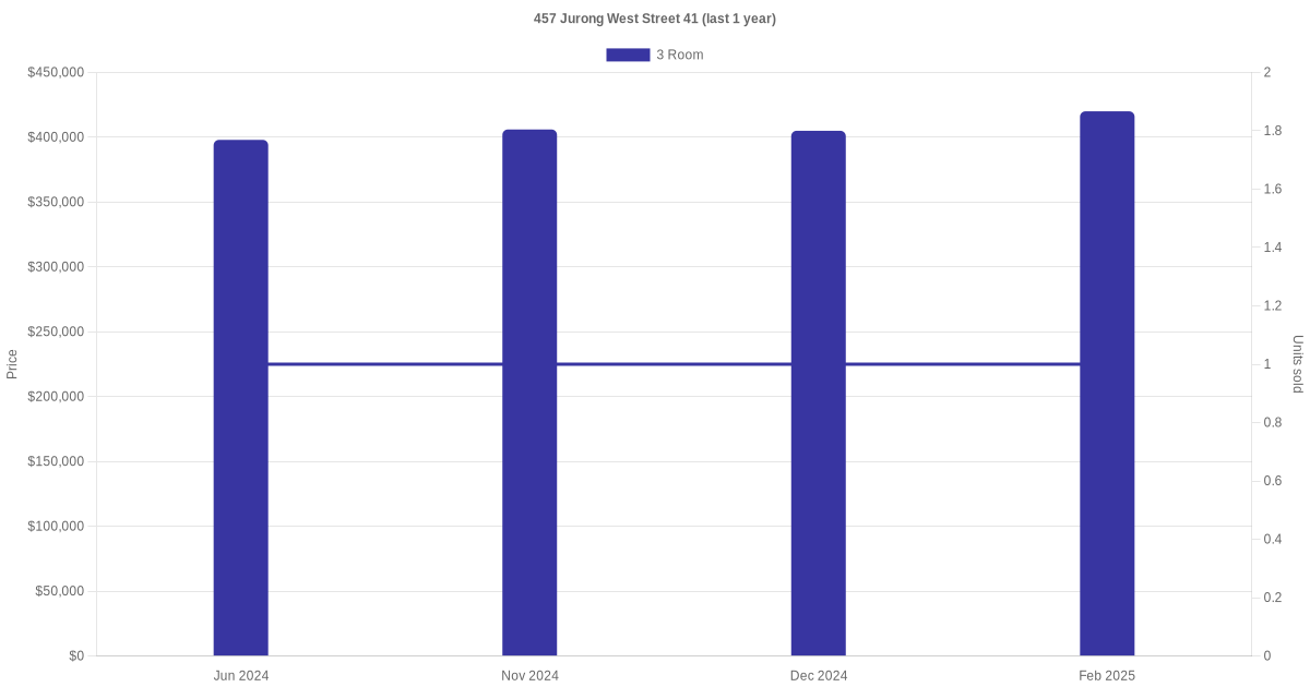 Below is a quick summary of the resale transactions volume and average price trends for the 3 room and 4 room units at 457 Jurong West Street 41.