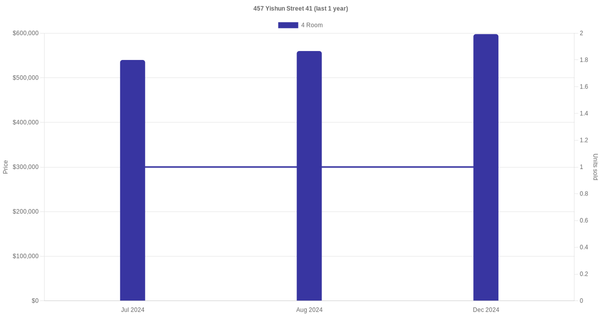 Below is a quick summary of the resale transactions volume and average price trends for the 4 room units at 457 Yishun Street 41.