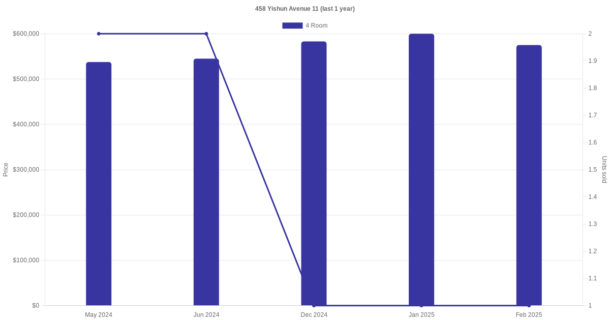 Below is a quick summary of the resale transactions volume and average price trends for the 4 room units at 458 Yishun Avenue 11.