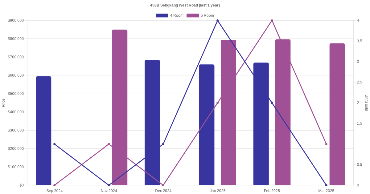 Below is a quick summary of the resale transactions volume and average price trends for the 4 room and 5 room units at 458B Sengkang West Road.