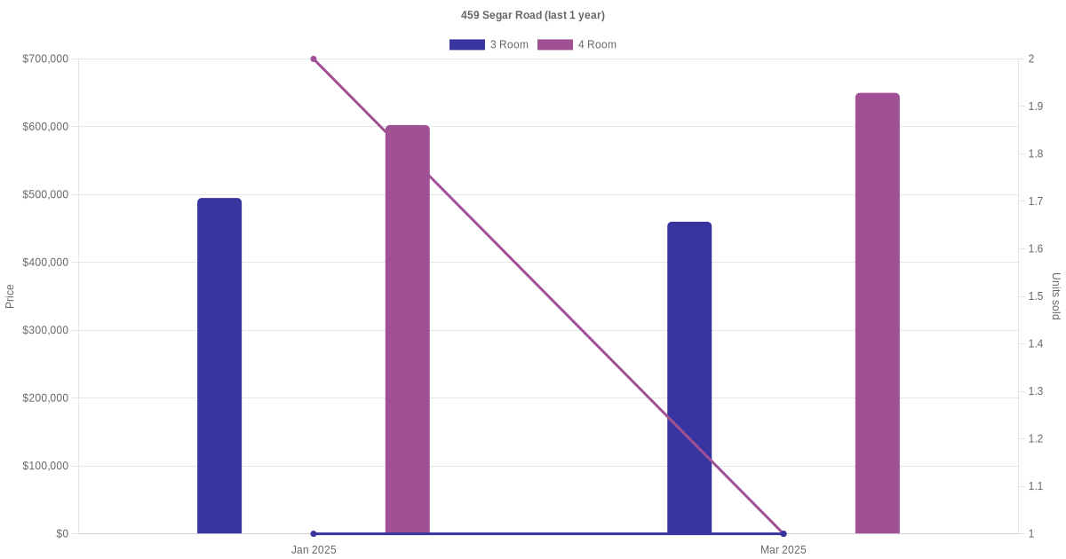 Below is a quick summary of the resale transactions volume and average price trends for the 3 room and 4 room units at 459 Segar Road.