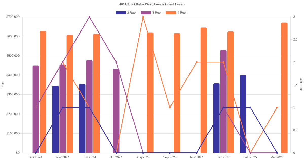 Below is a quick summary of the resale transactions volume and average price trends for the 2 room, 3 room and 4 room units at 460A Bukit Batok West Avenue 9.
