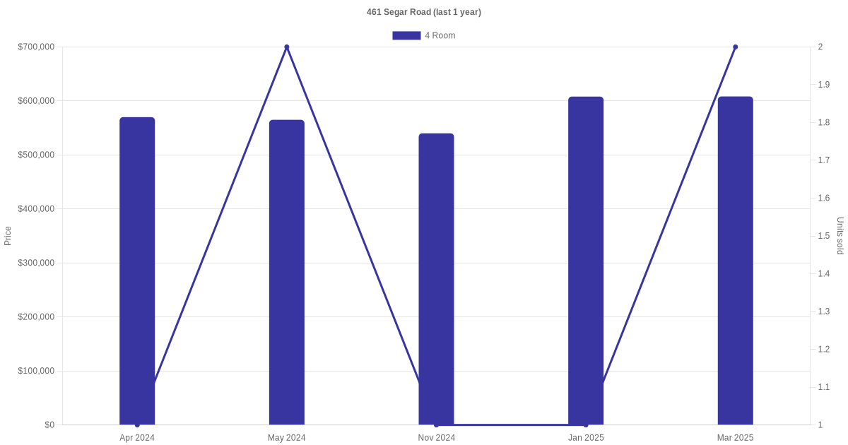 Below is a quick summary of the resale transactions volume and average price trends for the 4 room units at 461 Segar Road.