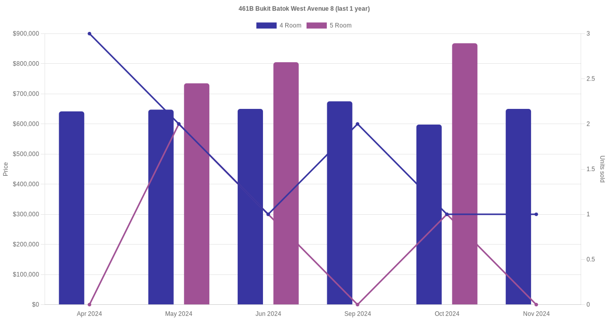 Below is a quick summary of the resale transactions volume and average price trends for the 4 room and 5 room units at 461B Bukit Batok West Avenue 8.
