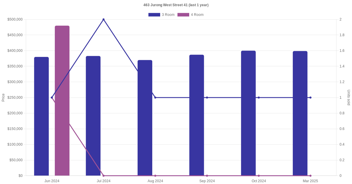 Below is a quick summary of the resale transactions volume and average price trends for the 3 room and 4 room units at 463 Jurong West Street 41.