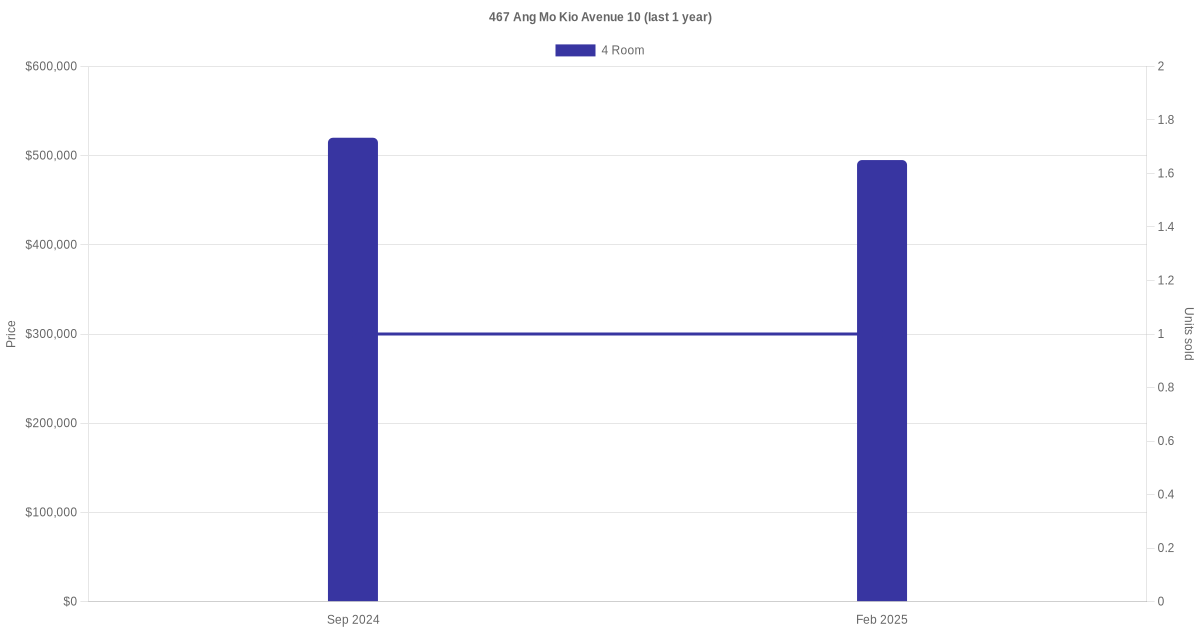 Below is a quick summary of the resale transactions volume and average price trends for the 4 room units at 467 Ang Mo Kio Avenue 10.