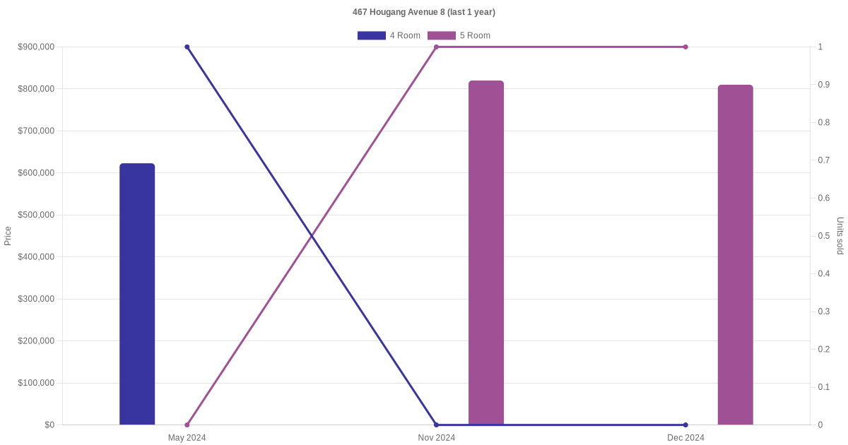Below is a quick summary of the resale transactions volume and average price trends for the 4 room and 5 room units at 467 Hougang Avenue 8.
