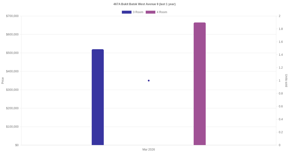 There were a total of 2 resale transactions in the last 3 years for units in block 467A Bukit Batok West Avenue 9, with the latest one recorded in Mar 2026.
