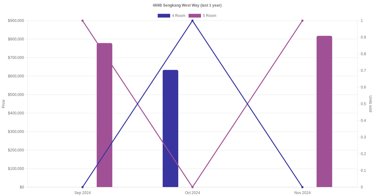 Below is a quick summary of the resale transactions volume and average price trends for the 4 room and 5 room units at 469B Sengkang West Way.