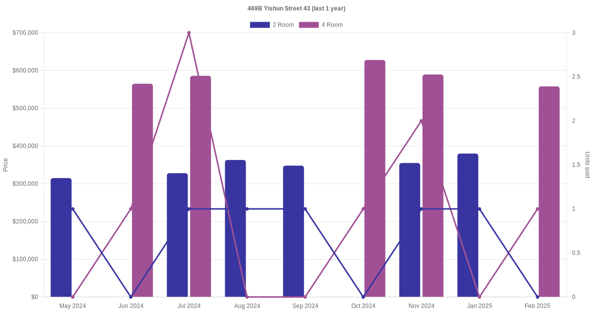 Below is a quick summary of the resale transactions volume and average price trends for the 2 room and 4 room units at 469B Yishun Street 43.