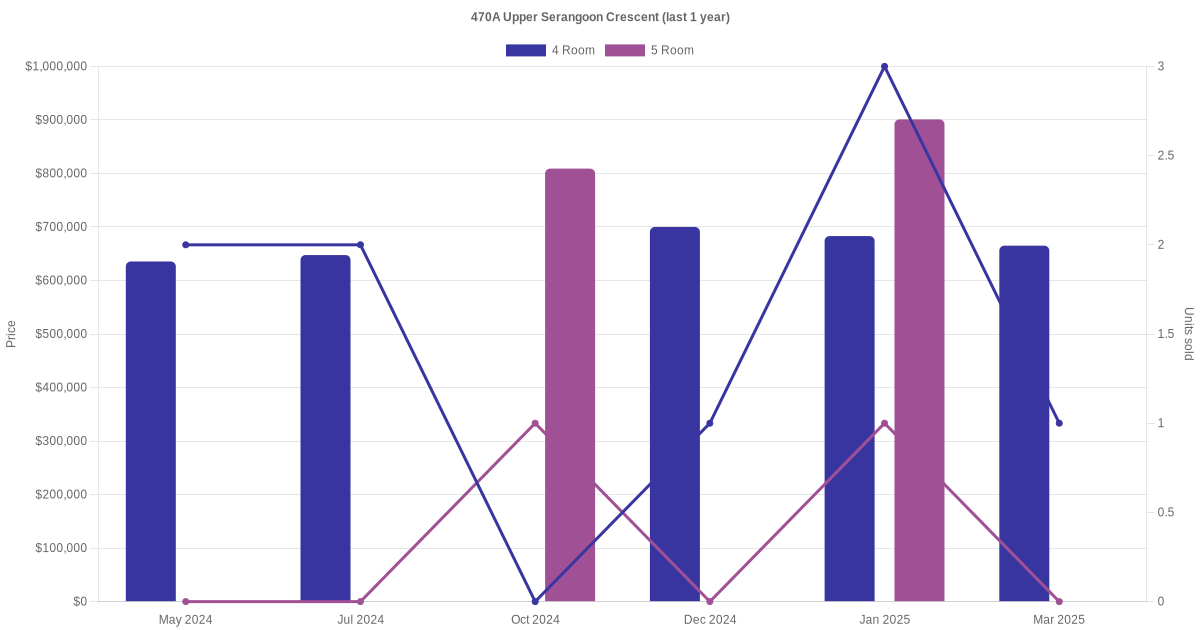 Below is a quick summary of the resale transactions volume and average price trends for the 4 room and 5 room units at 470A Upper Serangoon Crescent.