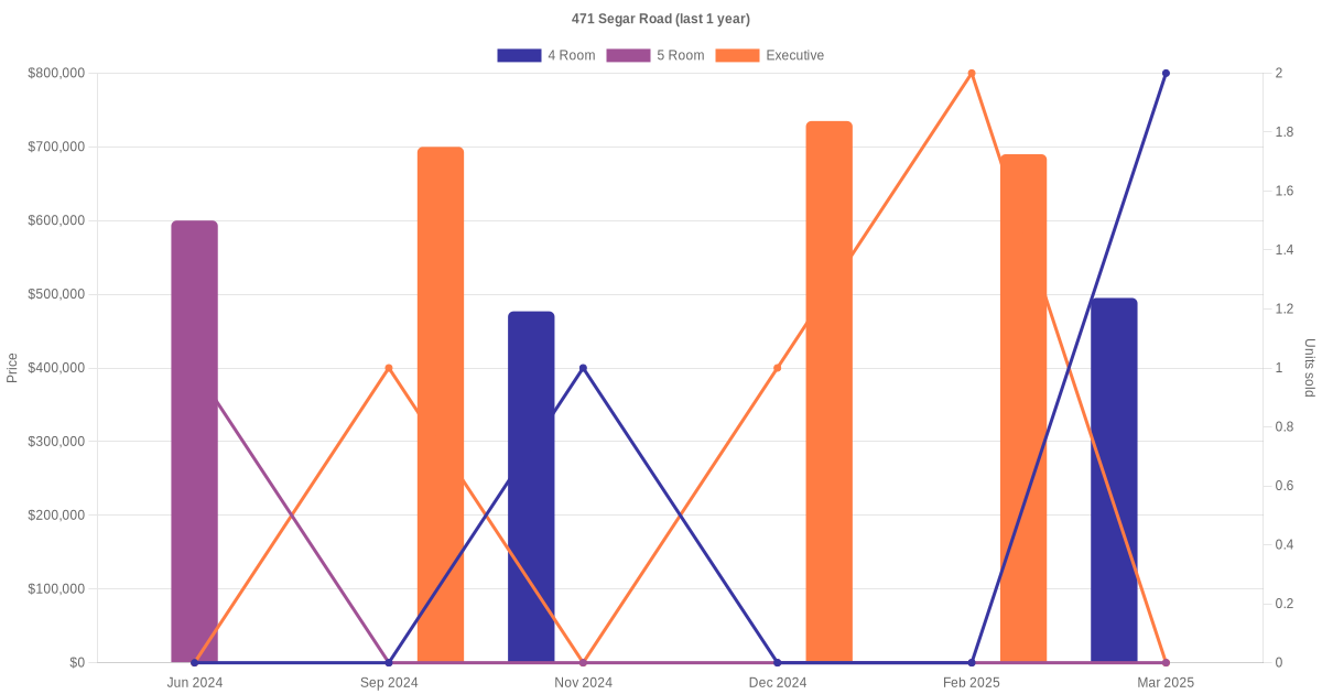 Below is a quick summary of the resale transactions volume and average price trends for the 4 room, 5 room and executive units at 471 Segar Road.