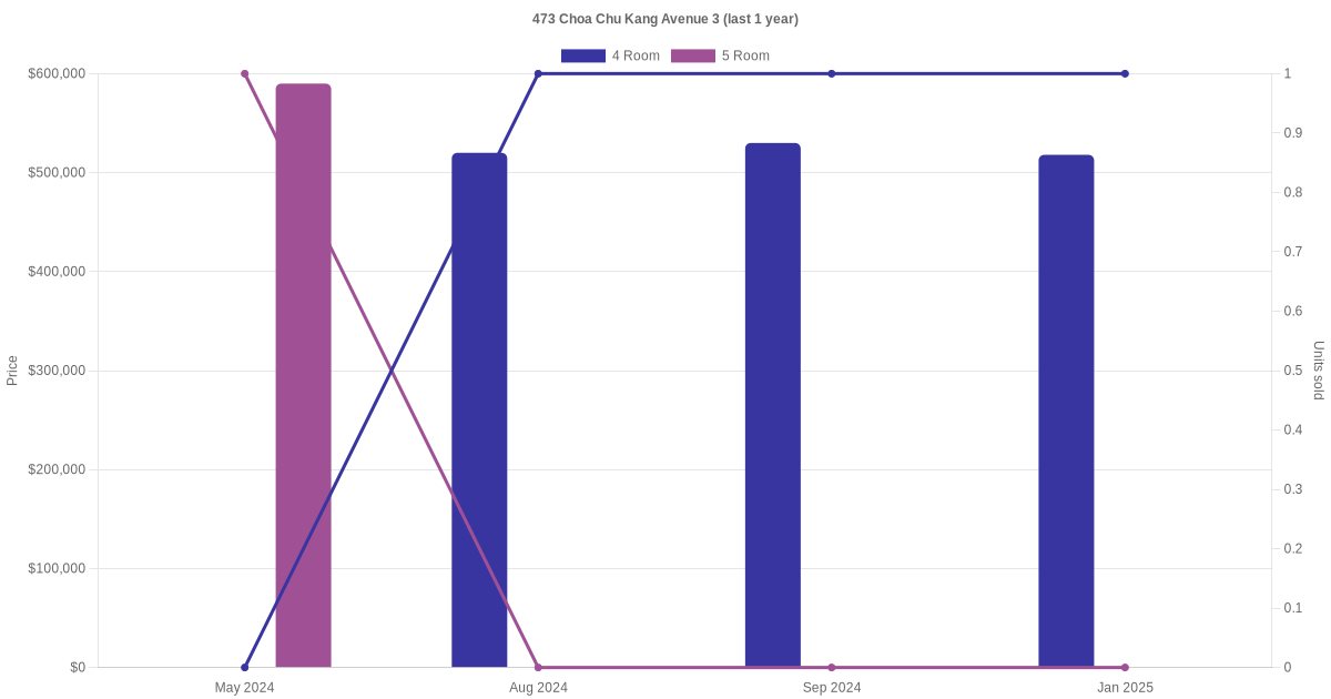 Below is a quick summary of the resale transactions volume and average price trends for the 4 room and 5 room units at 473 Choa Chu Kang Avenue 3.