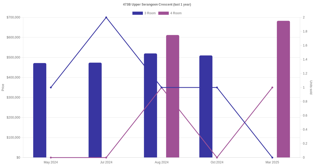 Here's a summary of the rental transactions and price trends for the 3 room and 4 room units at 473B Upper Serangoon Crescent.