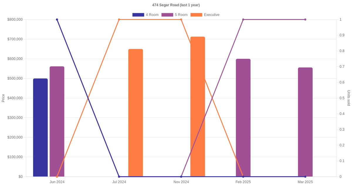 Below is a quick summary of the resale transactions volume and average price trends for the 4 room, 5 room and executive units at 474 Segar Road.