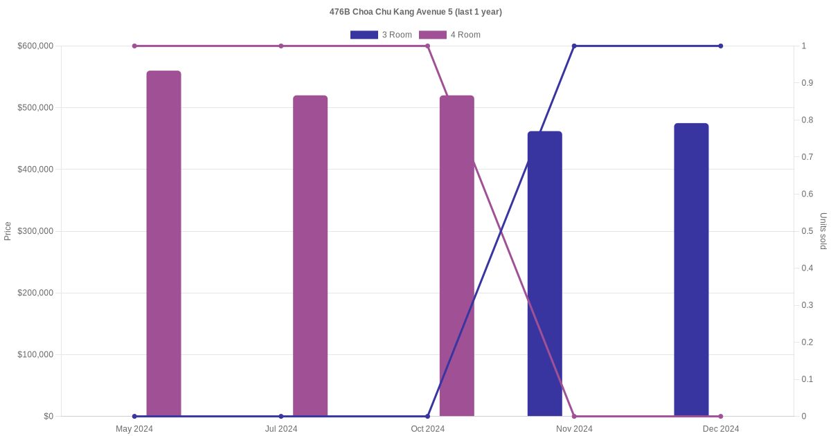 Below is a quick summary of the resale transactions volume and average price trends for the 3 room and 4 room units at 476B Choa Chu Kang Avenue 5.