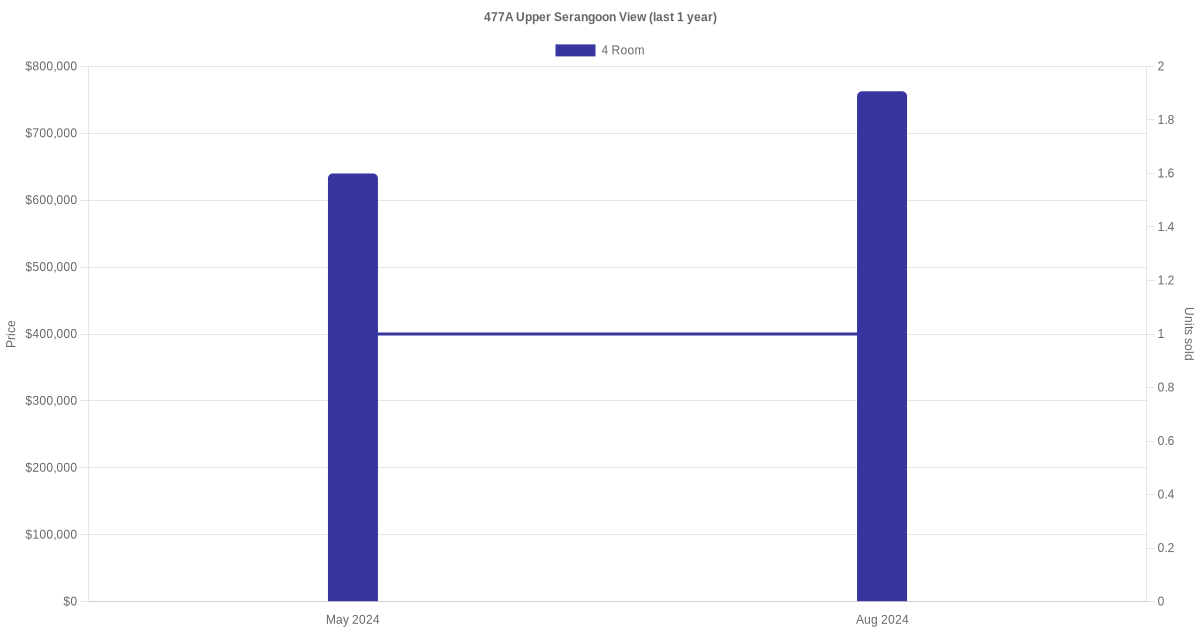 Below is a quick summary of the resale transactions volume and average price trends for the 4 room and 5 room units at 477A Upper Serangoon View.