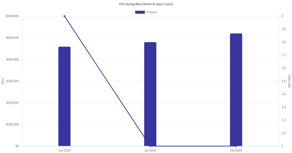 Below is a quick summary of the resale transactions volume and average price trends for the 4 room units at 478 Jurong West Street 41.