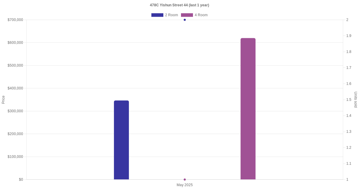 | May 2025 | $363,000 | $9,553 | 2 Room | Blk 478C Yishun Street 44 2 Room / 38 sqm | 13 to 15 | 38 sqm | 2-room | 2021 |