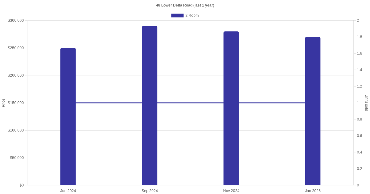 Below is a quick summary of the resale transactions volume and average price trends for the 2 room units at 48 Lower Delta Road.