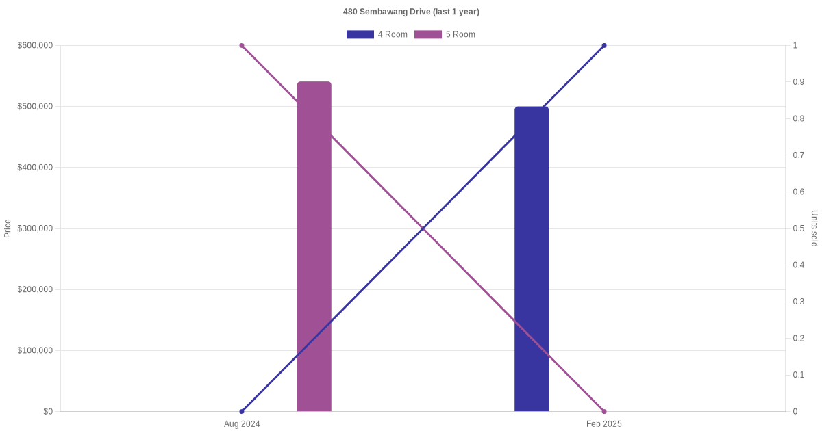 Below is a quick summary of the resale transactions volume and average price trends for the 4 room and 5 room units at 480 Sembawang Drive.