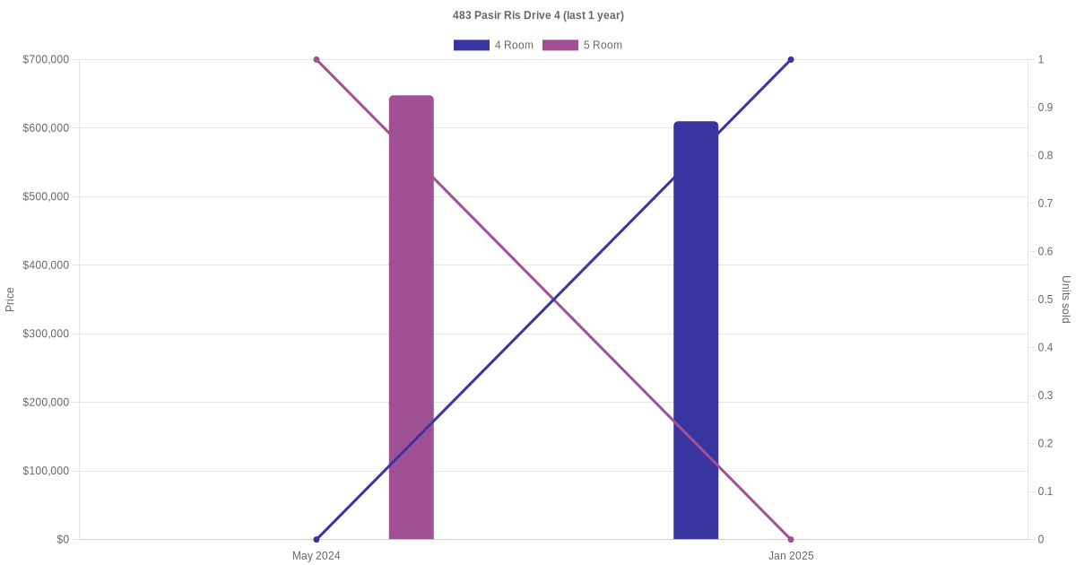 Below is a quick summary of the resale transactions volume and average price trends for the 4 room and 5 room units at 483 Pasir Ris Drive 4.