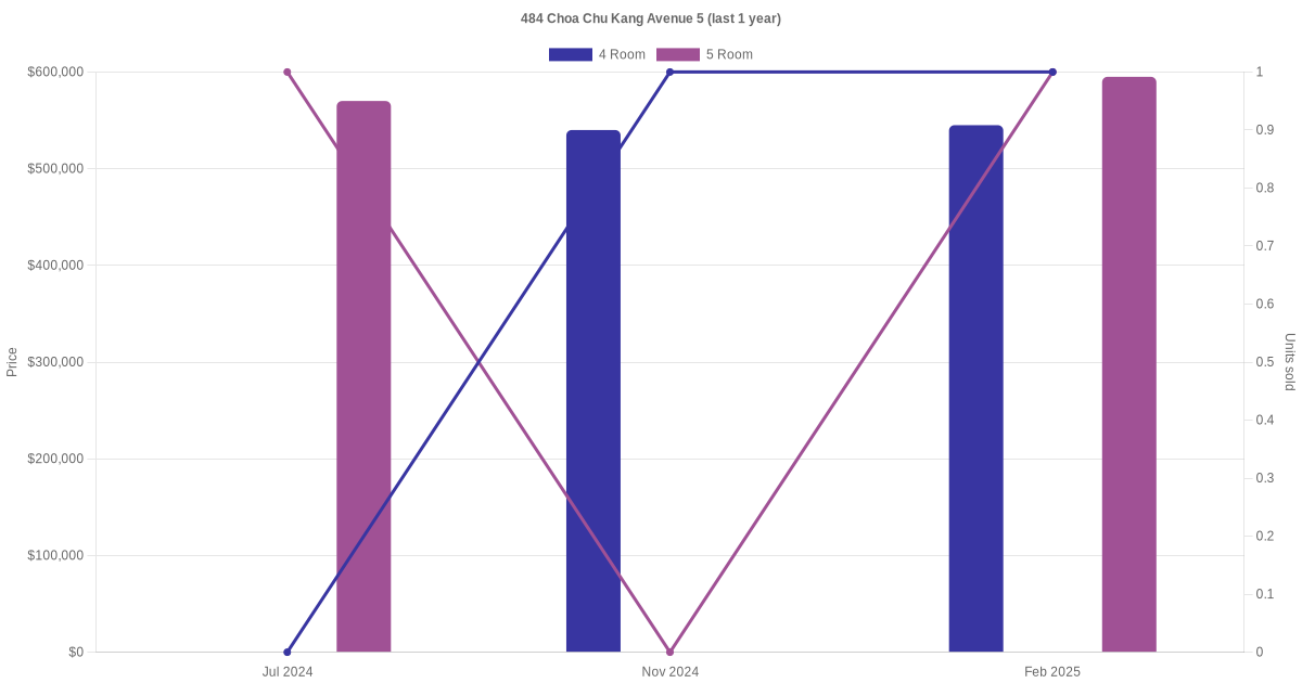 Below is a quick summary of the resale transactions volume and average price trends for the 4 room and 5 room units at 484 Choa Chu Kang Avenue 5.