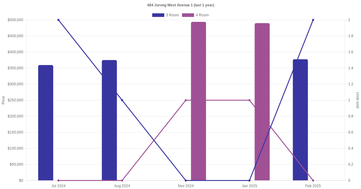 Below is a quick summary of the resale transactions volume and average price trends for the 3 room and 4 room units at 484 Jurong West Avenue 1.