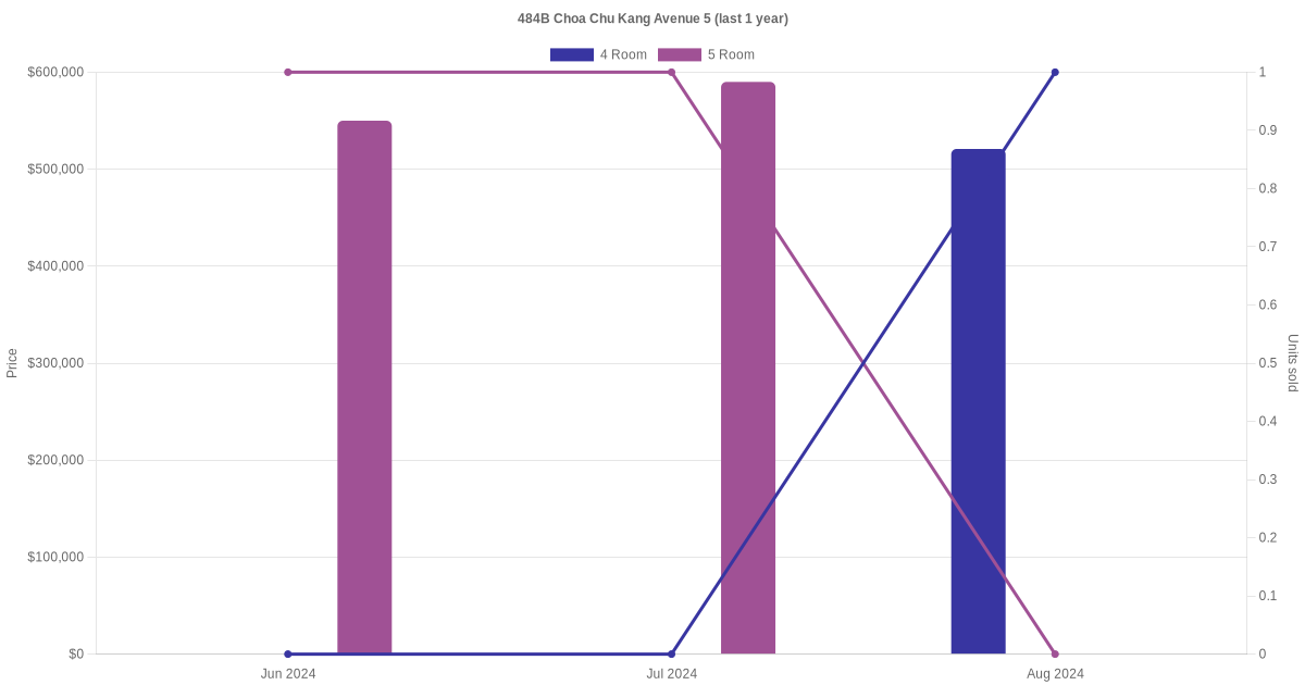 Below is a quick summary of the resale transactions volume and average price trends for the 4 room and 5 room units at 484B Choa Chu Kang Avenue 5.