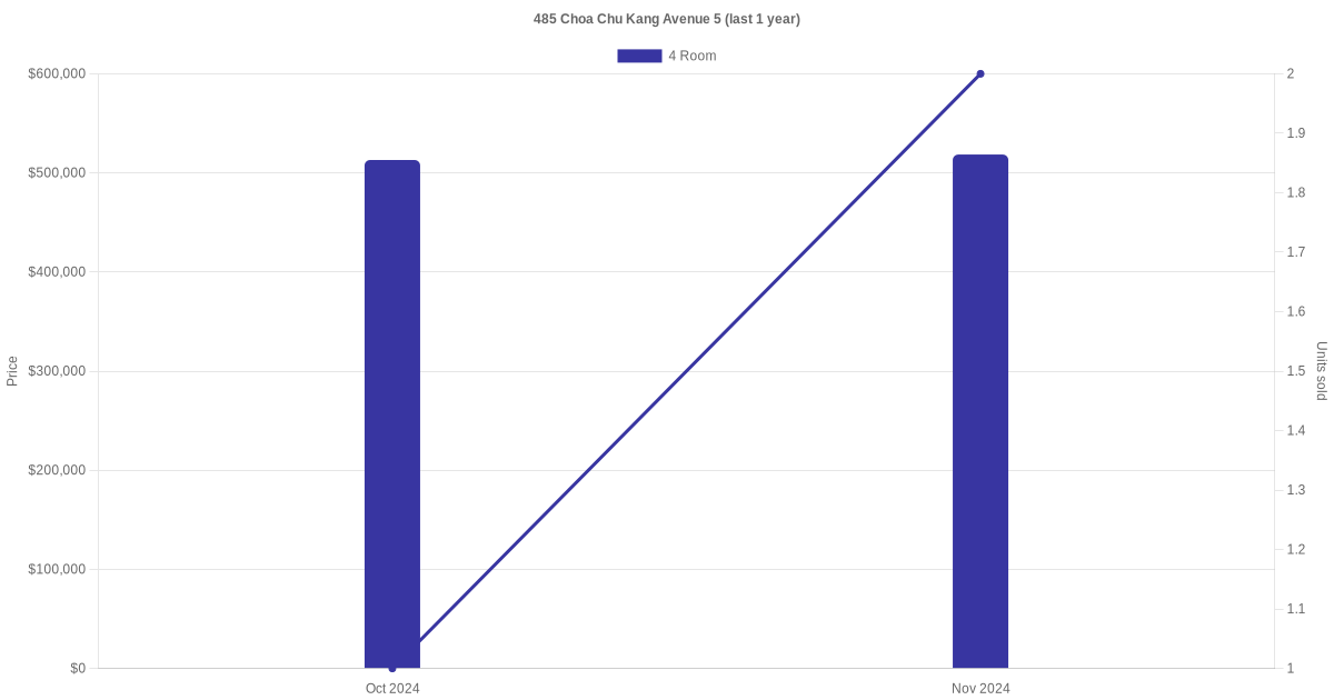 There were a total of 4 resale transactions in the last 3 years for units in block 485 Choa Chu Kang Avenue 5, with the latest one recorded in Nov 2024.