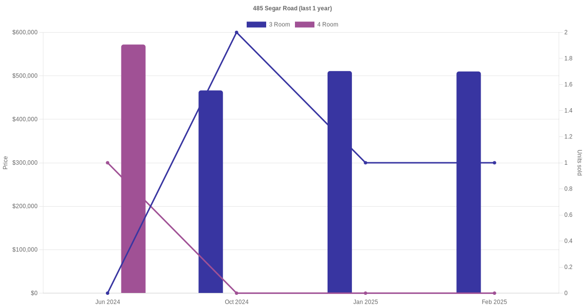 Below is a quick summary of the resale transactions volume and average price trends for the 3 room and 4 room units at 485 Segar Road.