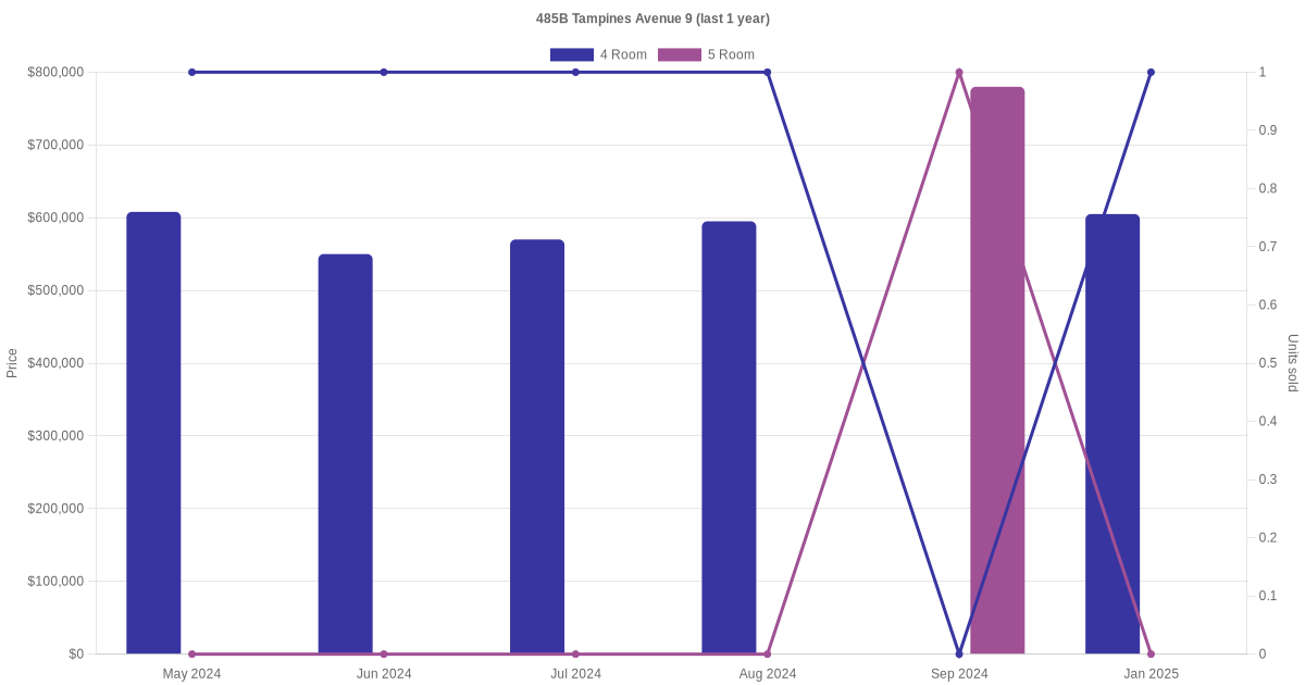 Below is a quick summary of the resale transactions volume and average price trends for the 4 room and 5 room units at 485B Tampines Avenue 9.