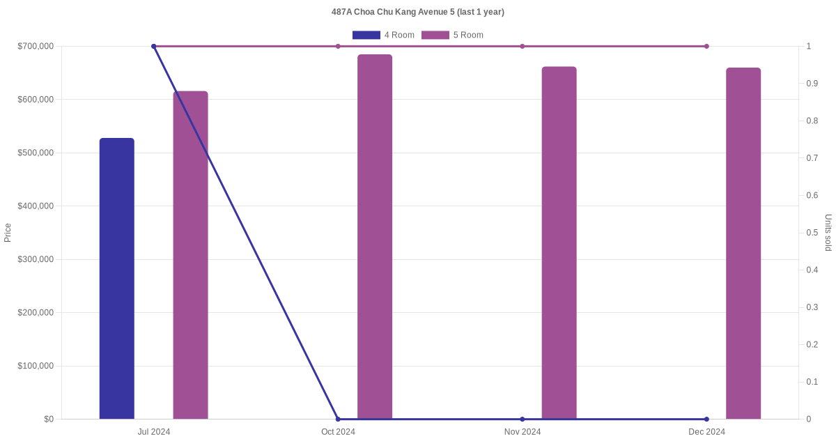 Below is a quick summary of the resale transactions volume and average price trends for the 4 room and 5 room units at 487A Choa Chu Kang Avenue 5.
