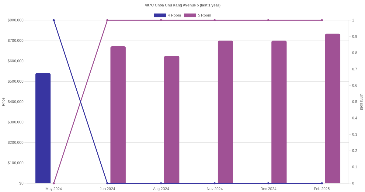 Below is a quick summary of the resale transactions volume and average price trends for the 4 room and 5 room units at 487C Choa Chu Kang Avenue 5.