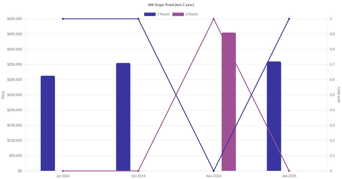 Below is a quick summary of the resale transactions volume and average price trends for the 2 room and 3 room units at 488 Segar Road.