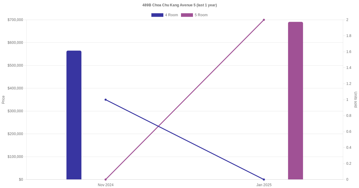 Below is a quick summary of the resale transactions volume and average price trends for the 4 room and 5 room units at 489B Choa Chu Kang Avenue 5.