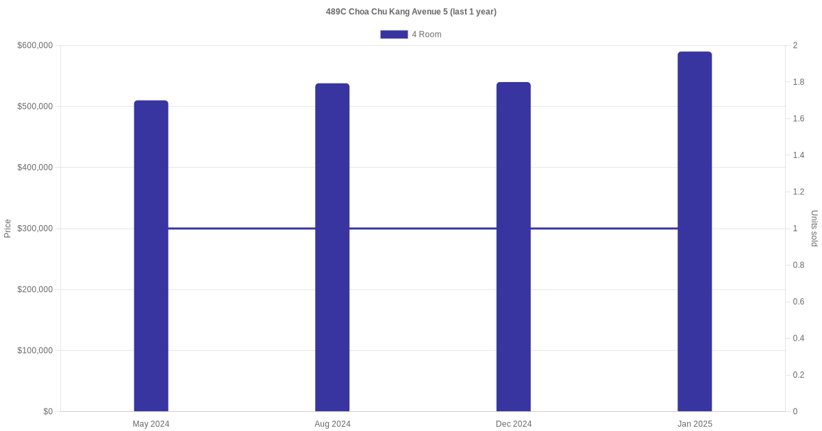 Below is a quick summary of the resale transactions volume and average price trends for the 4 room units at 489C Choa Chu Kang Avenue 5.