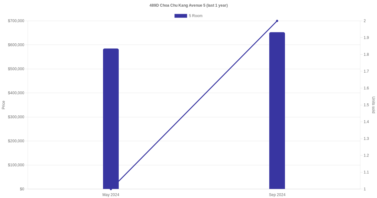 Below is a quick summary of the resale transactions volume and average price trends for the 4 room and 5 room units at 489D Choa Chu Kang Avenue 5.