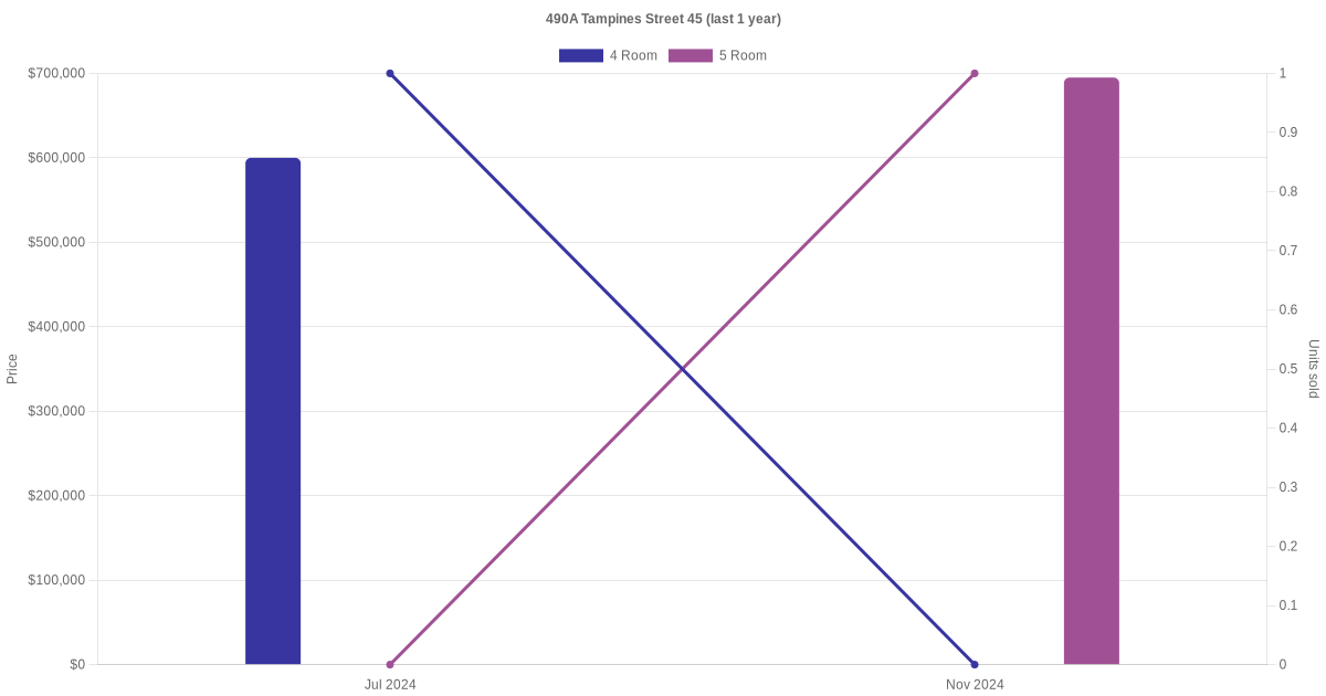 Below is a quick summary of the resale transactions volume and average price trends for the 4 room and 5 room units at 490A Tampines Street 45.