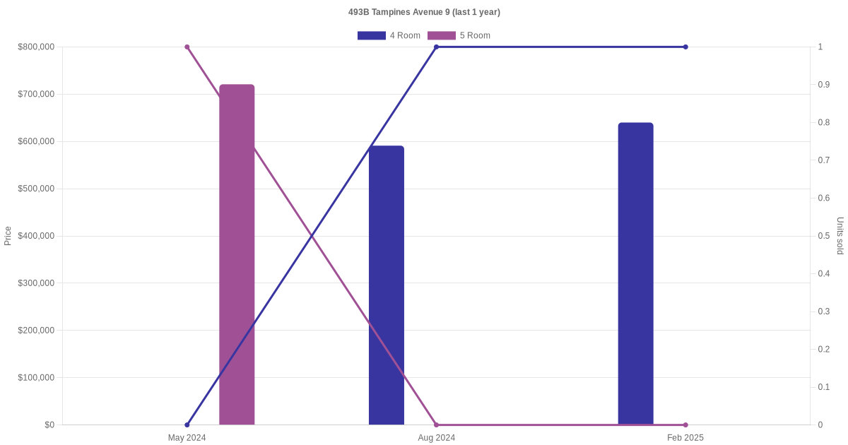 Below is a quick summary of the resale transactions volume and average price trends for the 4 room and 5 room units at 493B Tampines Avenue 9.