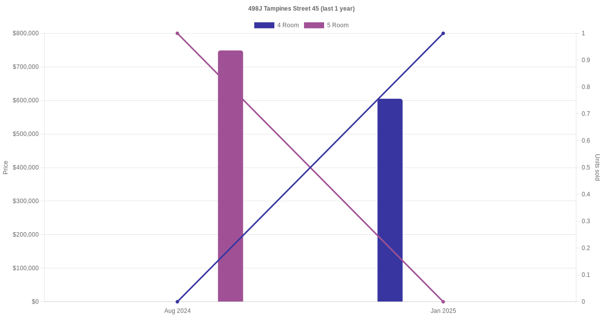 There were a total of 5 resale transactions in the last 3 years for units in block 498J Tampines Street 45, with the latest one recorded in Aug 2025.
