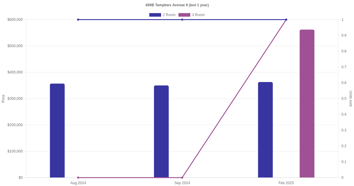 Below is a quick summary of the resale transactions volume and average price trends for the 2 room and 3 room units at 499B Tampines Avenue 9.