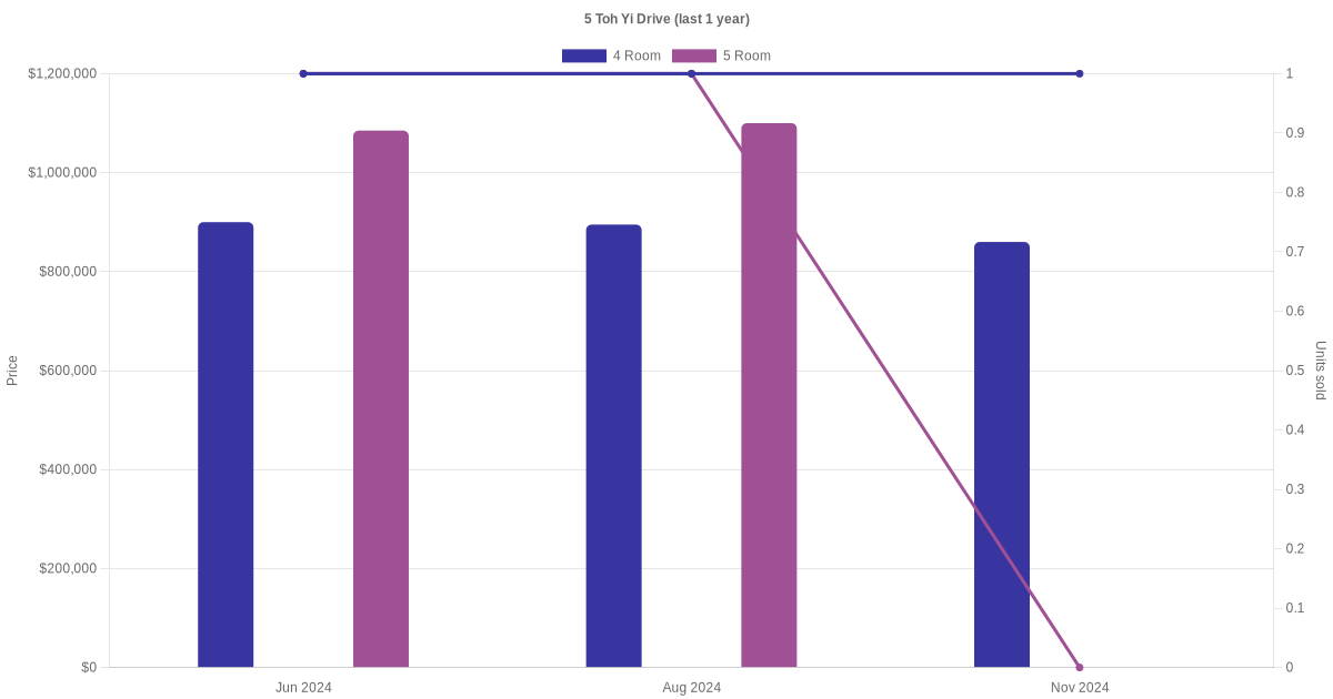Below is a quick summary of the resale transactions volume and average price trends for the 4 room and 5 room units at 5 Toh Yi Drive.