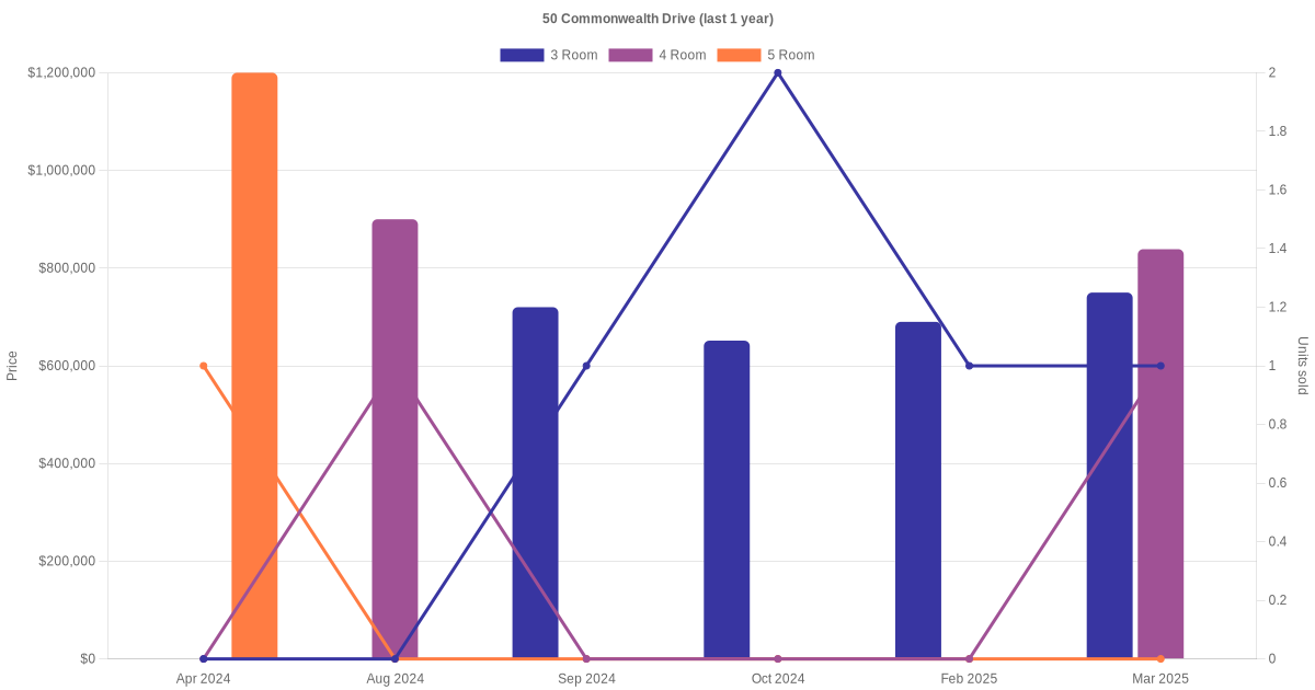 Here's a summary of the rental transactions and price trends for the 3 room, 4 room and 5 room units at 50 Commonwealth Drive.